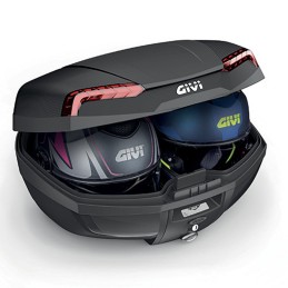 Il RIVIERA offre di serie un tappetino morbido removibile, fissato al fondo con chiusura a strappo, e può contenere due caschi, anche modulari (di dimensioni medie, come il GIVI X.21). Lo spazio interno permette di ospitare la borsa morbida GIVI T502B (optional). La serratura è compatibile con la chiave Security Lock SL101 (optional). Il top-case è predisposto per l’applicazione dello schienale E207 e per contatti elettrici utili al funzionamento di accessori optional futuri. L’impermeabilità è ottima: il prodotto è stato testato sia in laboratorio sia su strada sotto tempesta e grandine.