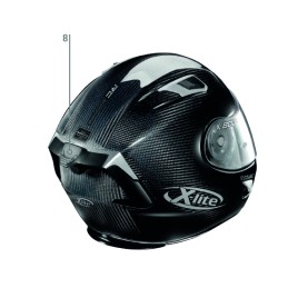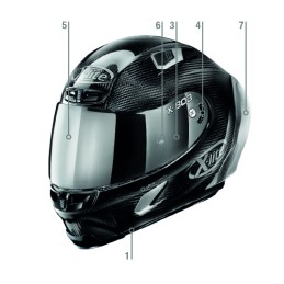 7 - RACETRACK AERODYNAMIC SPOILER (RAS) -  E’ un’appendice aerodinamica sviluppata con il contributo dei piloti ufficiali Nolan e X-lite, nonché frutto di studi CFD (Computational Fluid Dynamics) e di verifiche in galleria del vento. La conformazione della sua parte superiore riduce la resistenza aerodinamica del casco e ne migliora la stabilità alle alte velocità in posizione di guida sotto carena, soprattutto in continuità con l’eventuale appendice posteriore presente sulla tuta del pilota; la conformazione delle sue parti laterali migliora, invece, la stabilità del casco alle alte velocità in uscita dal cupolino. Può essere rimossa dal casco in funzione delle condizioni di utilizzo e/o situazioni di guida, per esempio in presenza di un passeggero.