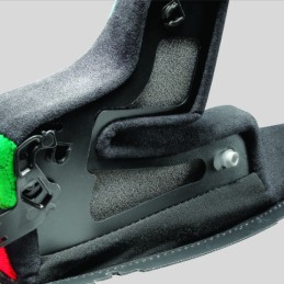 Tale sistema, il cui brevetto è in corso di concessione, consente di eseguire una regolazione della posizione della cuffia il che, a parità di taglia del casco, permette di cambiare l’assetto del casco stesso sulla testa adattandolo alle diverse esigenze e conformazioni anatomiche.