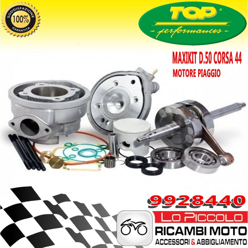 Maxi kit TPR by top performance in alluminio con CILINDRO diam.50mm e corsa lunga 44mm per scooter con motore Piaggio-Gilera a liquido. Pistone monofascia diam.50mm e fascia cromata da 1mm. Testa scomposta tronco conica in alluminio con squish calcolato, albero motore tpr spalle piene con biella da 85mm e spinotto da 12mm, cilindrata 86,35cc